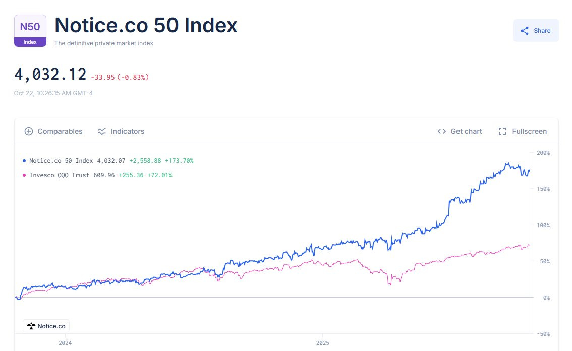The Notice 50 Index, which (very roughly) tracks share prices for the top 50 private cos, has wildly “outperformed” the Nasdaq.3
