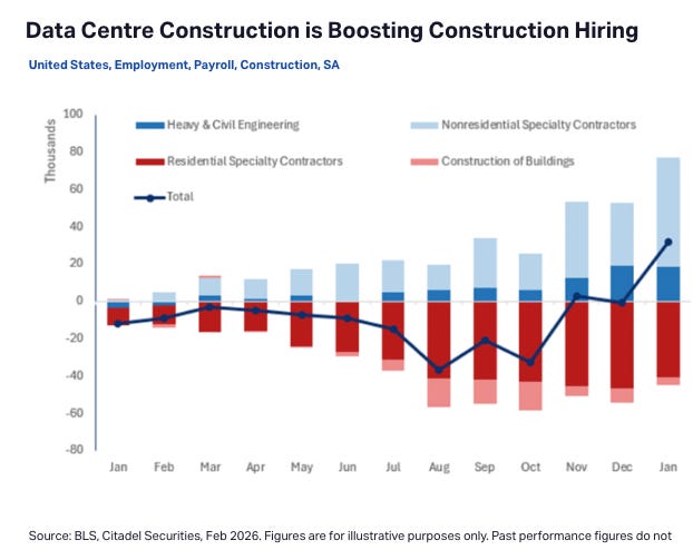 Data centers have created a run on specialty contractors and engineers, but elsewhere, construction employment is pretty tepid.