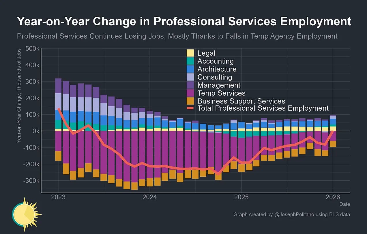 Professional Services employment is on net breakeven, but lawyers, architects, and consultants are getting hired a little more than before.