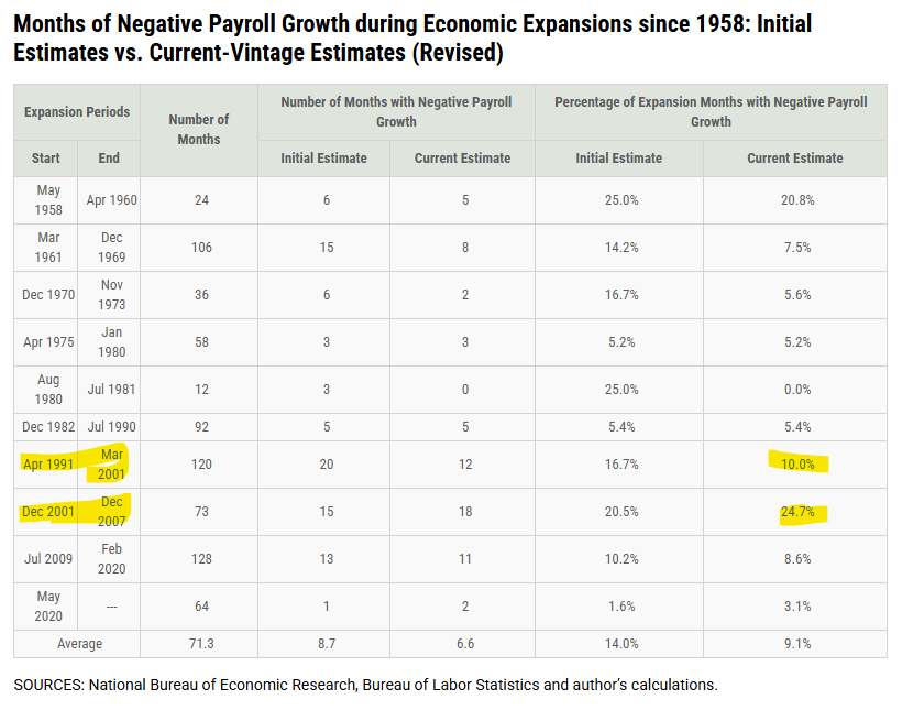 1991-2007 (but especially 2001-2007) had the highest share of negative payroll months for any expansionary period.