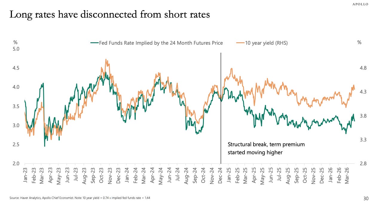Iâve long wondered whether higher long-term rates are just a thing, and the Fed canât do anything about it (because long-term rates are driven by supply-and-demand, and the marginal buyer of US debt is looking at the deficit and demanding yield). In other words, the Fed can lower short-term rates, but long-term rates are whatever the market demands.