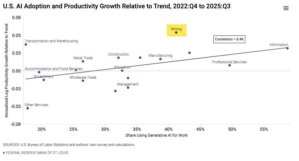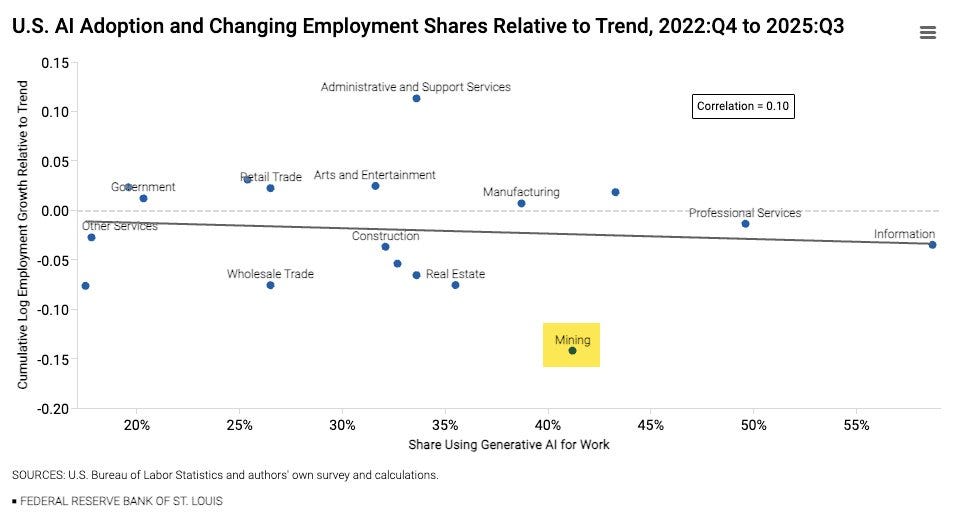 Mining is a standout for AI adoption (with above-trend productivity), but has done little in the way of extra hiring (in fact, hiring is below-trend). Mostly, the point of the research is to show no-correlation between AI Adoption and Hiring (for better or for worse) because AI is a Job Maker, Not a Job Taker, but if you want to be gloomy, well the miners are going to be SOL.