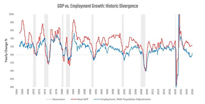 First, a nice illustration of just how unusual it is to have such a yawning gap between GDP growth and employment growth: