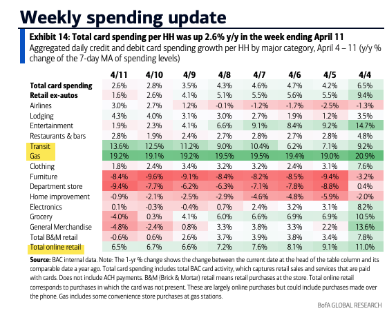 Transit, Gas, and e-comm (and I suppose lodging), are the only categories comfortably in the green.