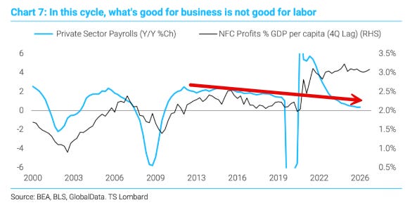 Private sector payrolls showing steadily declining growth, accompanied by a huge jump in profits.