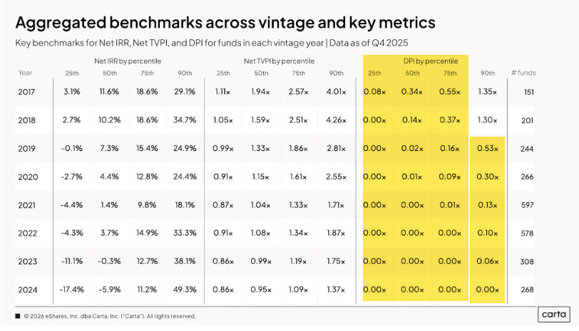 The only two categories of VC funds to have DPI > 1 (i.e. returned more cold-hard-cash than received) are top-decile funds from the 2017 and 2018 vintages.